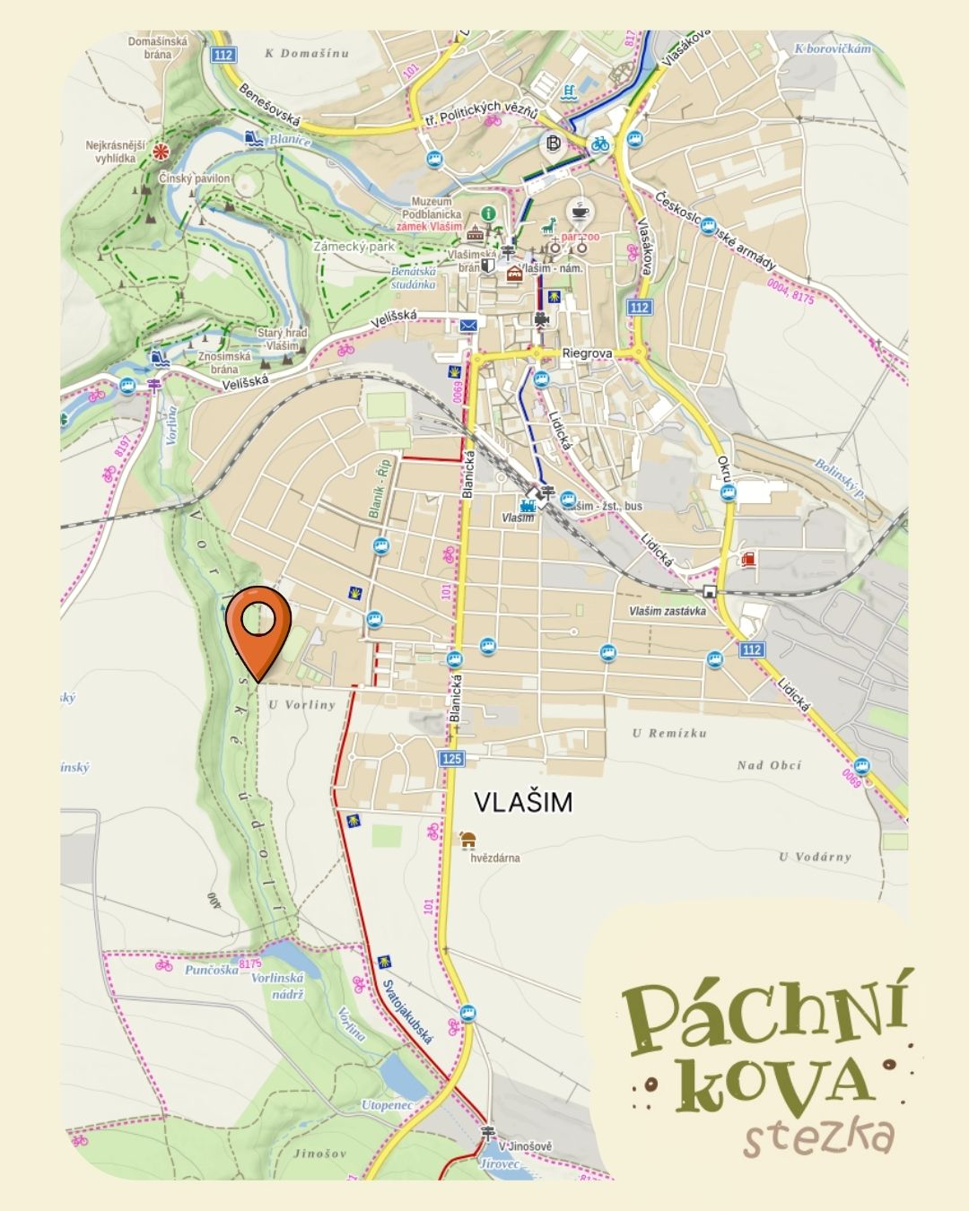 Páchníkova stezka je okruh dlouhý 2,7 km, obsahuje 8 zastavení s nenápadnými panely, které nenarušují divokou krásu údolí. Cesta vede částečně po nové mlatové cestě, kterou vybudovalo město Vlašim v části od ulice V sadě k Vorlinské nádrži. Další část stezky vede úzkou lesní pěšinkou členitým terénem. I když je stezka krátká, neklouzavá turistická obuv se určitě vyplatí. V nejprudší části přibyly zemní schody, Lesy ČR opět obnovily přístup k oblíbené studánce, která rovněž projde rekonstrukcí.