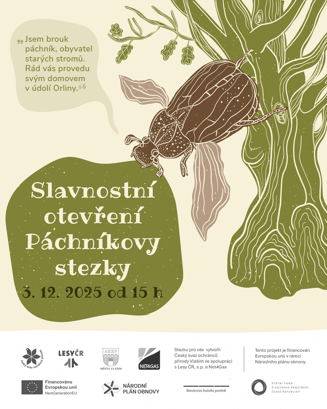 Český svaz ochránců přírody vytvořil pro veřejnost nenápadnou stezku, která upozorňuje na význam cenných biotopových stromů v lese. Stezka v kaňonovitém údolí potoka Orliny bude slavnostně otevřena 3. 12. 2025 v 15 h.
