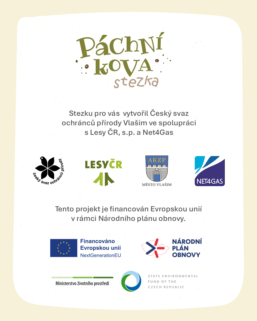 Vznik stezky byl možný díky financování Evropskou unií v rámci Národního plánu obnovy v rámci projektu Vzdělávání pro odolný les a díky daru Net4Gas. Stezka je dalším z dlouhé řady projektů „Blíž přírodě“ zpřístupňujících přírodní krásy veřejnosti, které Net4Gas podpořila.