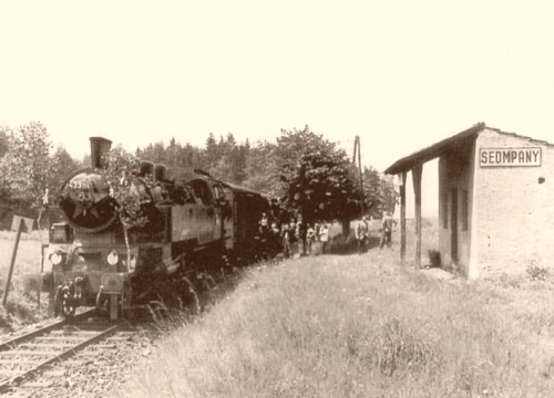 K místnímu koloritu patří i násep bývalé železniční trati, po kterém dnes vede lesní cesta. Trať z Trhového Štěpánova do Dolních Kralovic byla dlouhá téměř 14 kilometrů a v provozu od roku 1902 do roku 1975, kdy musela ustoupit stavbě přehrady Želivka. Části zrušené trati byly využity na silnice a lesní cesty, zachovány jsou i mostky a propustky. Za silniční křižovatkou stávala vlaková zastávka Sedmpány.