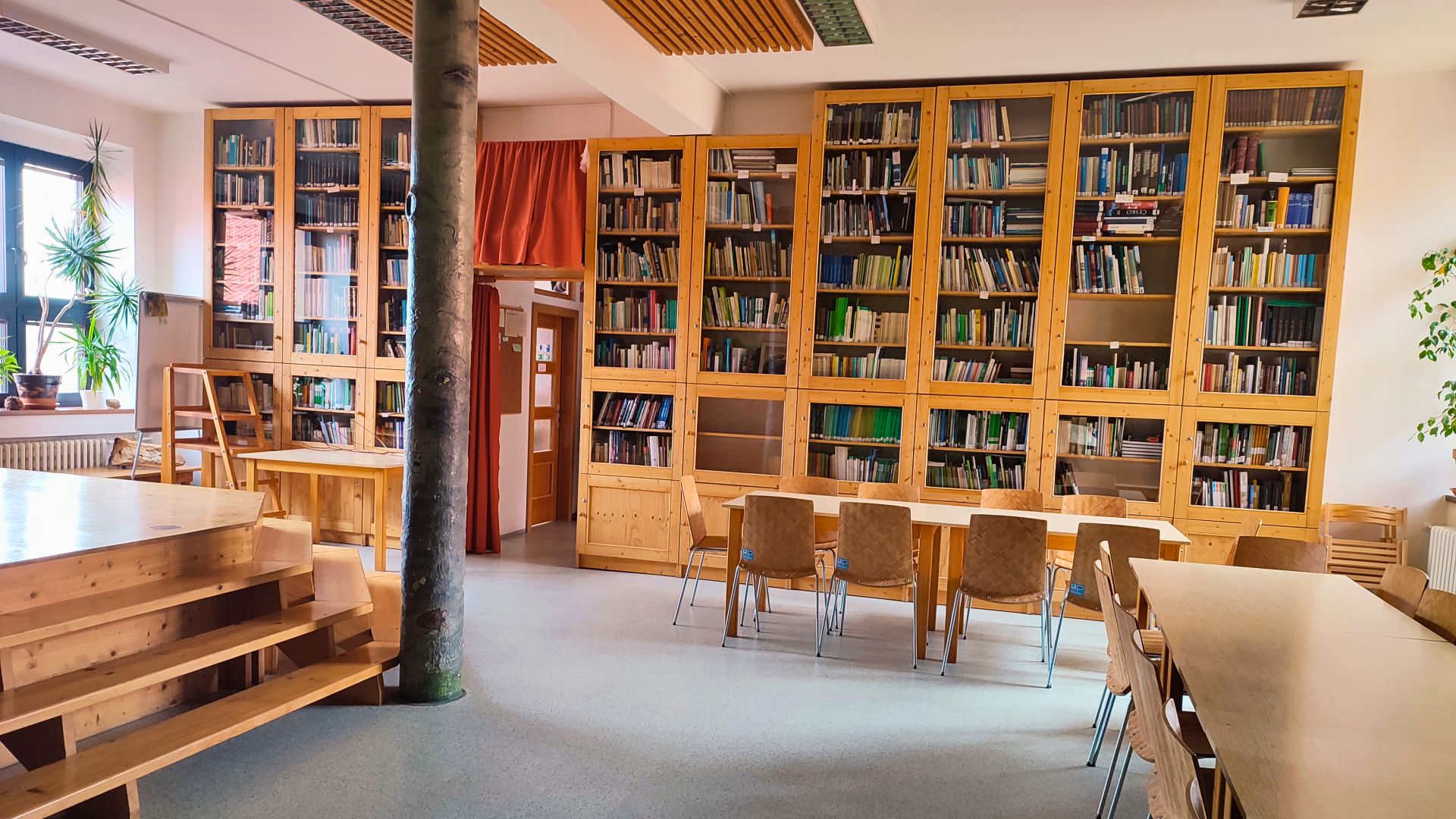Učebna je vhodná pro menší skupiny a umožňuje kombinovat klasické sezení u stolů s neformálním setkáním na pódiu.