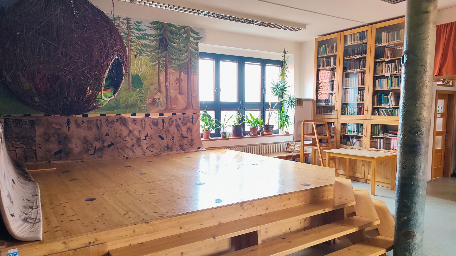 Součástí prostoru je i pódium s možností sezení na zemi, které vytváří příjemné zázemí pro neformální práci ve skupině.